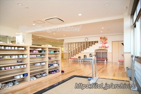 園舎に入ってすぐの広々としたスペースは、雨が降って園庭で遊べないときの運動スペースを目的として広く設けたもので、梅雨時期などは身体を動かして遊べない子どもたちのストレス解消の場としても役立つと思います。