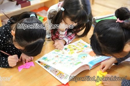 絵を描き終わった子どもは、本を見ながら折り紙をしたり、小さなピースを組み合わせて思い思いの形を作ったりと、好きな遊びに熱中しています。また積み木を組み合わせて大きな作品に仕上げるのも当園の伝統的な遊びのひとつになっています。